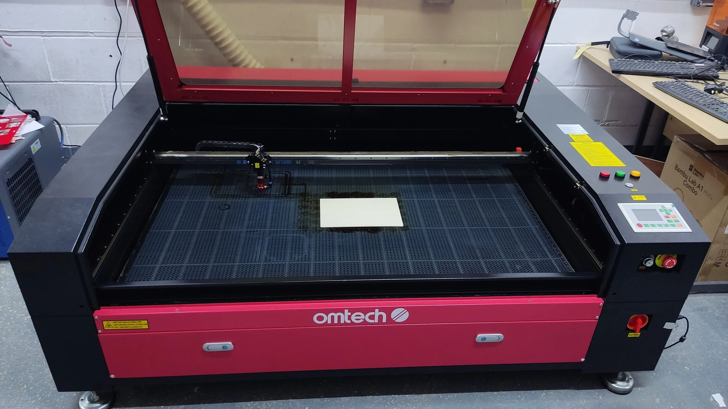 Last Friday, with only 2 hours notice, we scrambled to assemble a team of volunteers to take delivery of our brand new Omtech Max-1393. Yes, you read that correctly; not second hand, brand new! This is the culmination of almost a year of crowd funding and organising to find the biggest and best machine that we could fit in the space. We owe a huge debt of thanks to the many members who contributed, as well as Spirax Sarco, a local business who generously donated to our appeal.